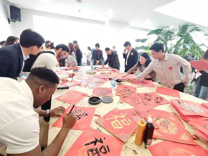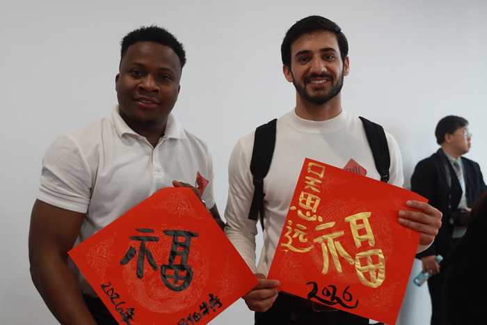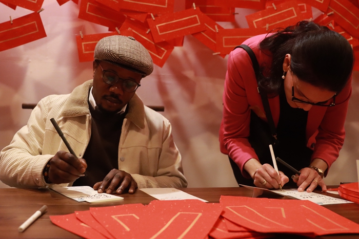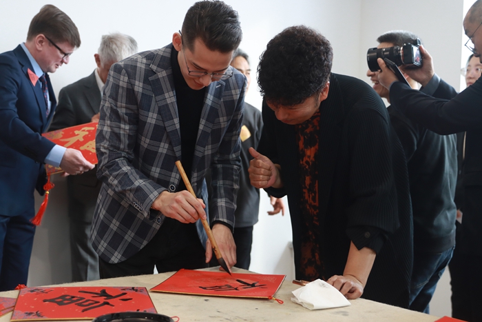 外籍嘉宾在艺术家的指导下提笔写“福”