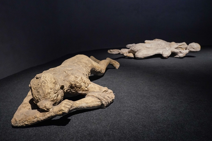 本展展出的三件铸像(一对成年遇难者、一只家犬及一位少女)均为“大庞贝计划”框架下的高精度复制品。它们并非简单的仿制品,而是基于材料分析、骨骼学研究和三维成像等技术对原型的科学重审。这些铸像凝固了生命最后一刻的姿态:人类与家犬或匍匐、或依偎、或蜷缩,成为人与自然暴力对抗的沉默见证。