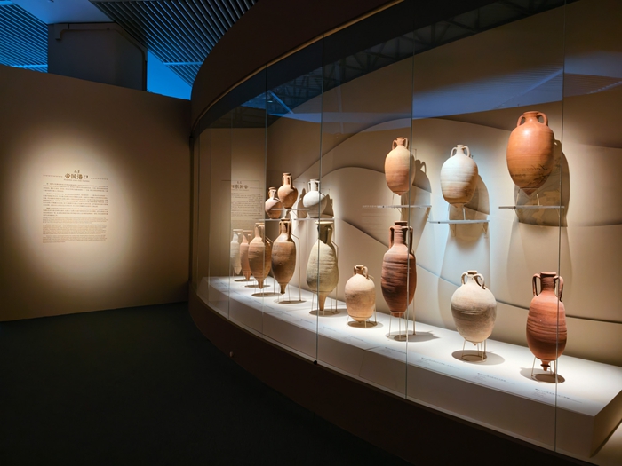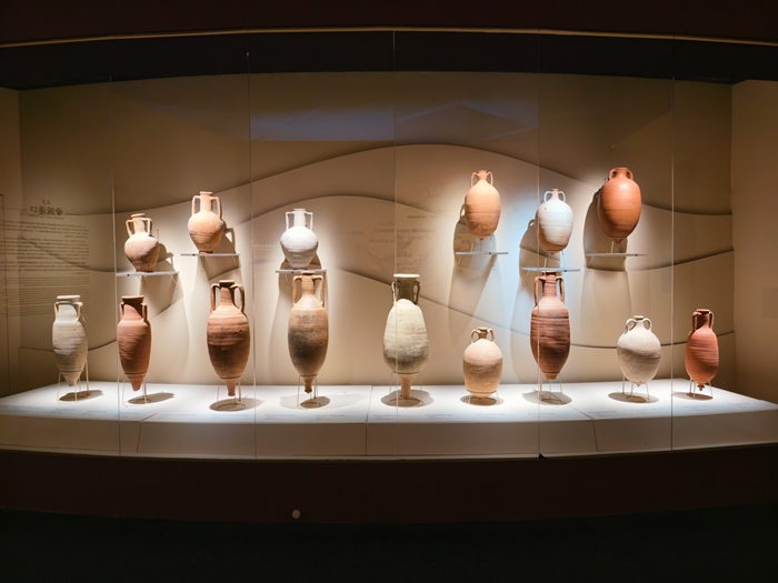 一组来自地中海不同地区的双耳陶罐,揭示了庞贝作为罗马帝国商贸枢纽的重要地位。这些陶罐来自克里特岛、北非及西班牙南部,用于运输葡萄酒、橄榄油、鱼酱等商品。不同产地的陶罐在器型、体量与结构上各具特色,成为辨识商品来源的重要线索。